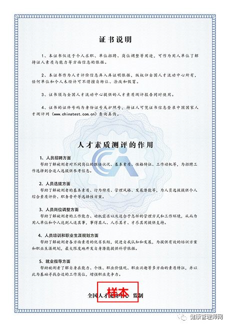证书的基本情况:人才素质测评证书在人社部人才流动中心官网上可以统一查询,同时向全国进入人才流动中心招聘企业统一可见,所以对企业和一些猎头公司都有重要的参考意义。证书正面是持证人的信息和证书编号等信息,背面是人社部人才流动中收对证书的一个使用说明。